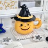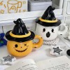 Both mugs are topped with black witch-hat lids, complete with a bright yellow band, adding a whimsical touch and helping keep drinks warm. Styled alongside star ornaments and cozy desk accessories, the set creates a festive, warm Halloween atmosphere perfect for gifting, decorating, or enjoying your favorite seasonal drink.