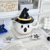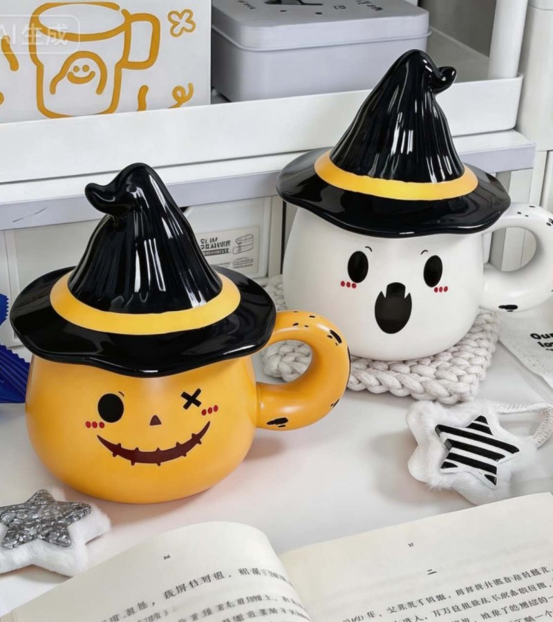 These are the selections of Halloween-themed ceramic mugs that brings playful spooky vibes to any desk or kitchen. The orange mug features a stitched jack-o’-lantern face with an X-eye and a crooked stitched smile, giving it a quirky, mischievous personality. The white mug complements it with a soft, rounded ghost expression— wide eyes and an open “boo” mouth that feels cute rather than scary.